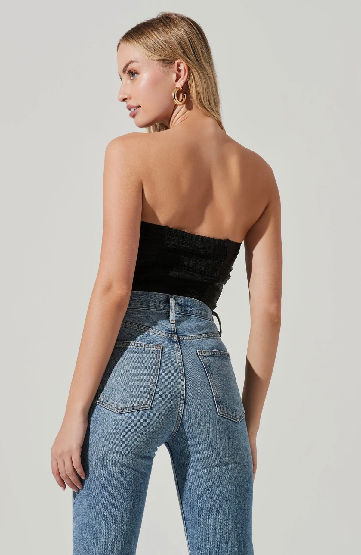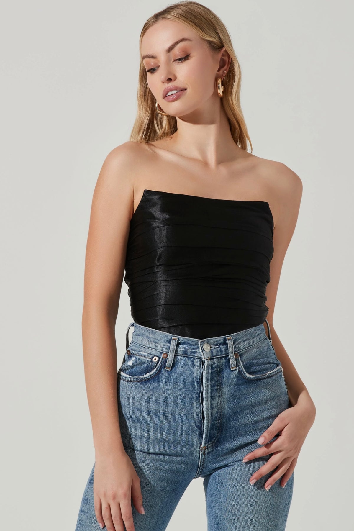 The Mercury Top features a high-shine satin finish. Sleeveless neckline leads to a ruched bodice. Smocked back.