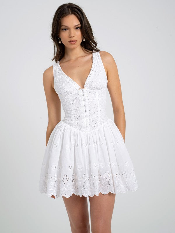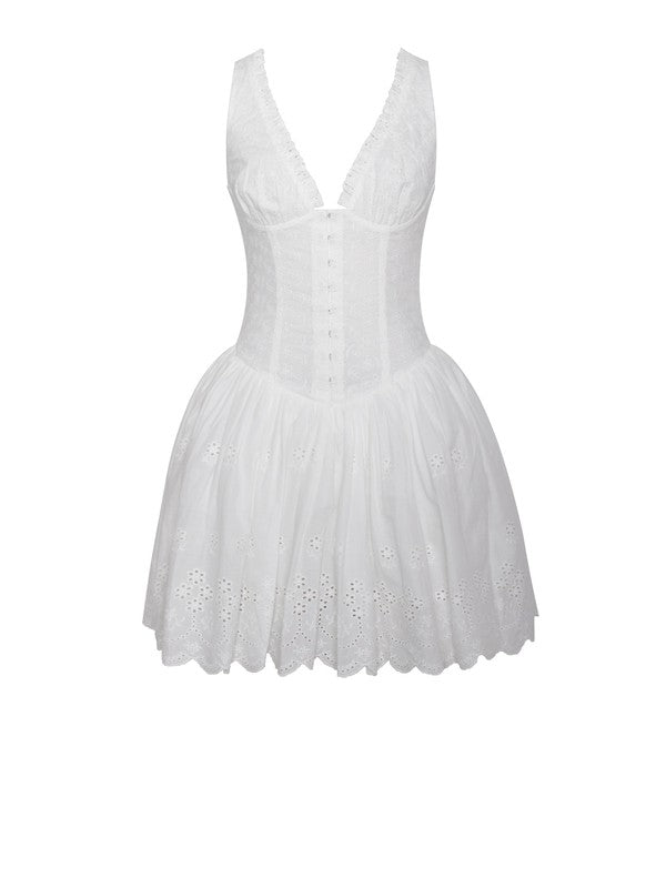 Step into sophistication with our eyelet plunge halter mini dress, a masterpiece crafted from elegant eyelet eco-luxe fabric. This dress showcases a plunging halter neckline adorned with a pleated trim, exuding bold sophistication, and a contemporary drop waist design. The skirt is enhanced with customized trimming for a unique flair and layered with support for added structure. A built-in corset provides both comfort and a flattering fit, while an invisible zipper at the mid-back ensures a seamless finish. Perfect for any special occasion, this mini dress effortlessly combines classic charm with modern details, making it a standout choice for your wardrobe.