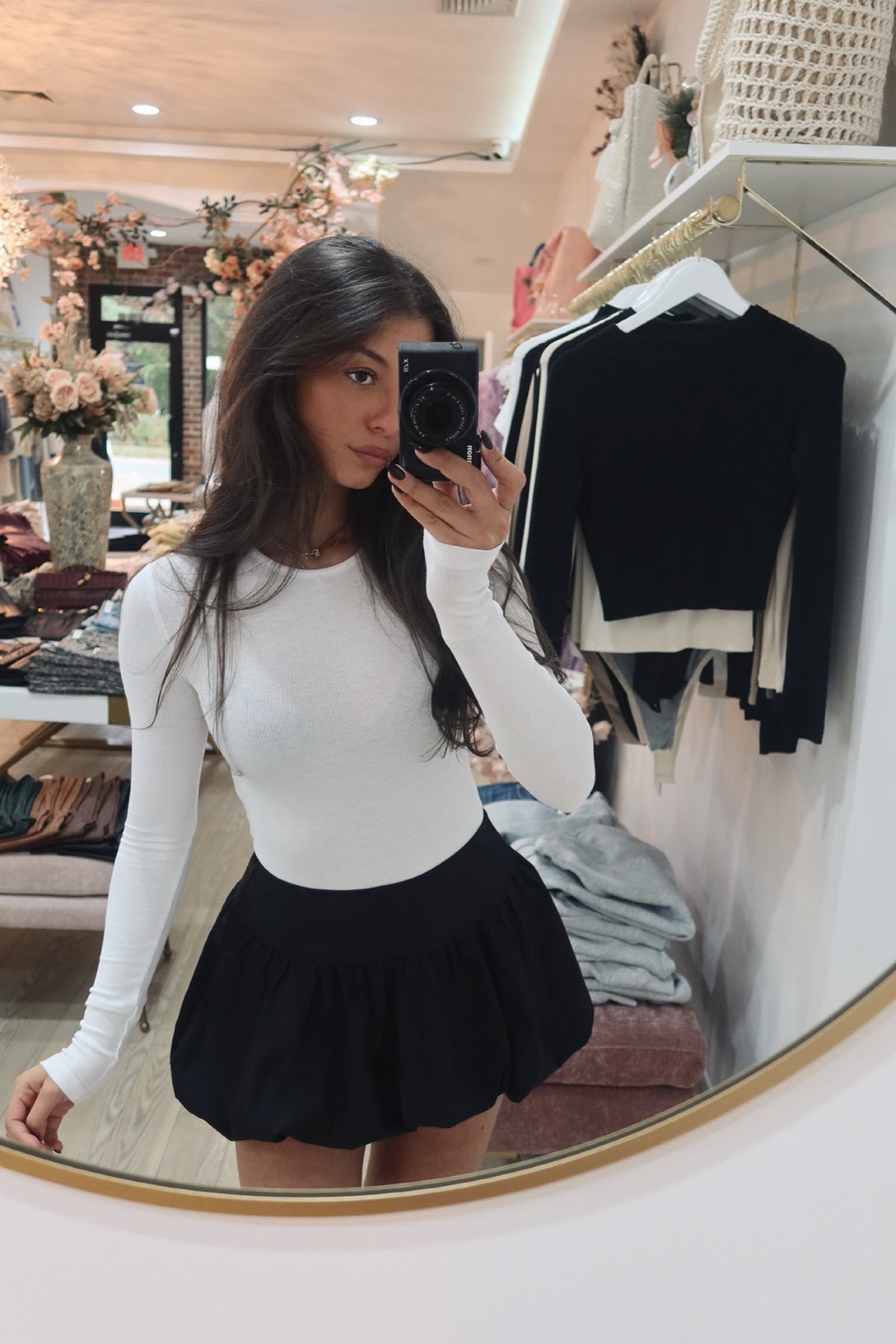 Make a statement with this playful yet polished black mini skirt. Designed with a flattering high waist and voluminous bubble silhouette, this skirt adds instant flair to any outfit. The lightweight fabric creates beautiful movement. Style it with a sleek off-the-shoulder top and boots for a night out, or dress it down with a cozy knit for daytime chic. Fun, flirty, and impossible to ignore—this skirt is your new standout piece.