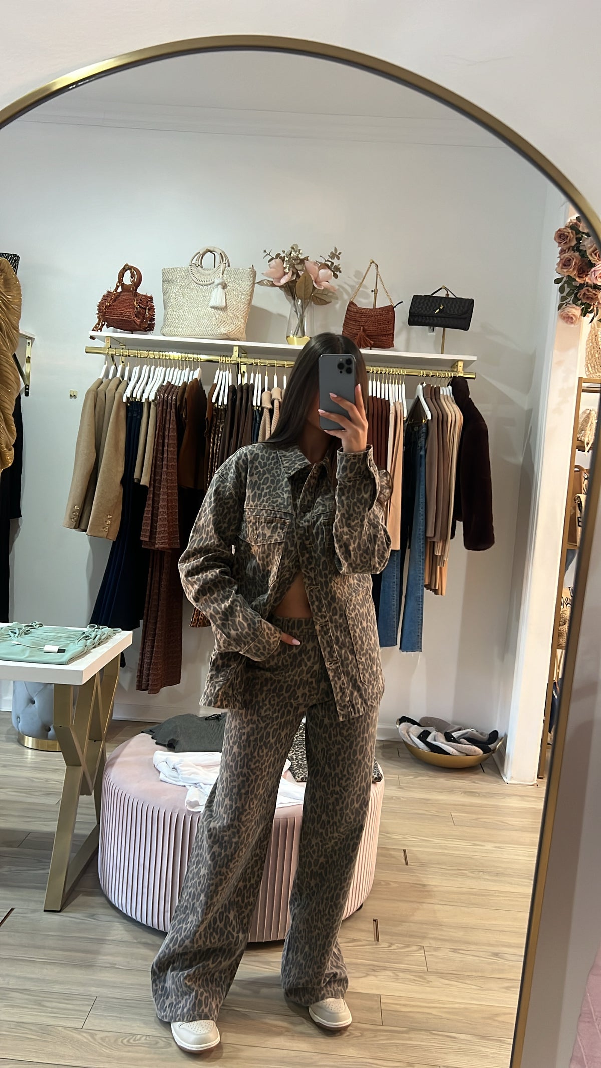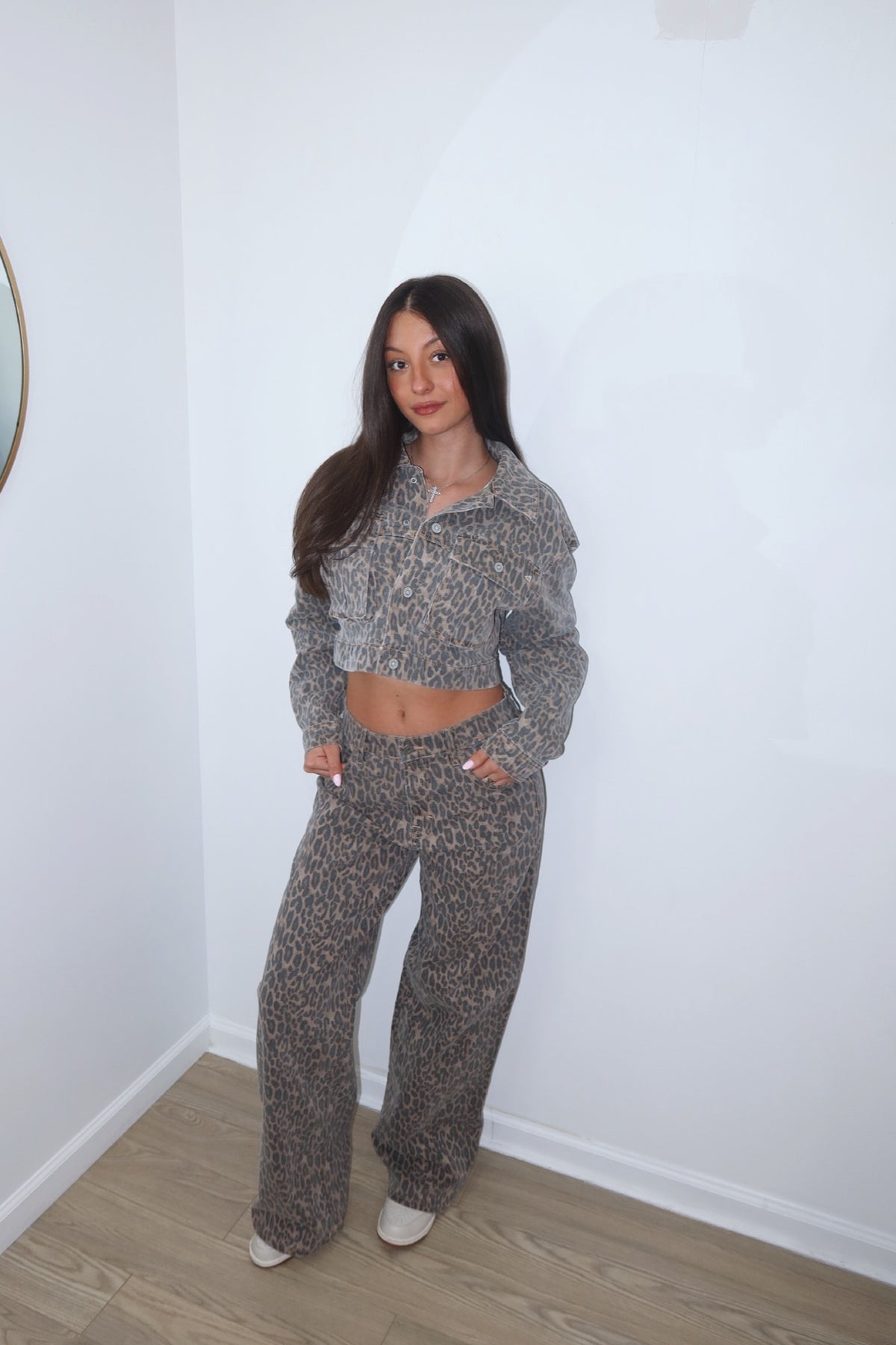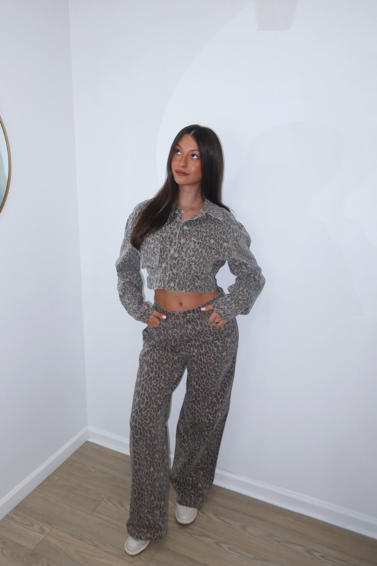 Oversized. The perfect mix of edgy and chic. These leopard-print denim jeans are your it-girl city moment. Oversized and sits on your hips for the ultimate effortless vibe. Pair with your favorite tee or our matching shacket.