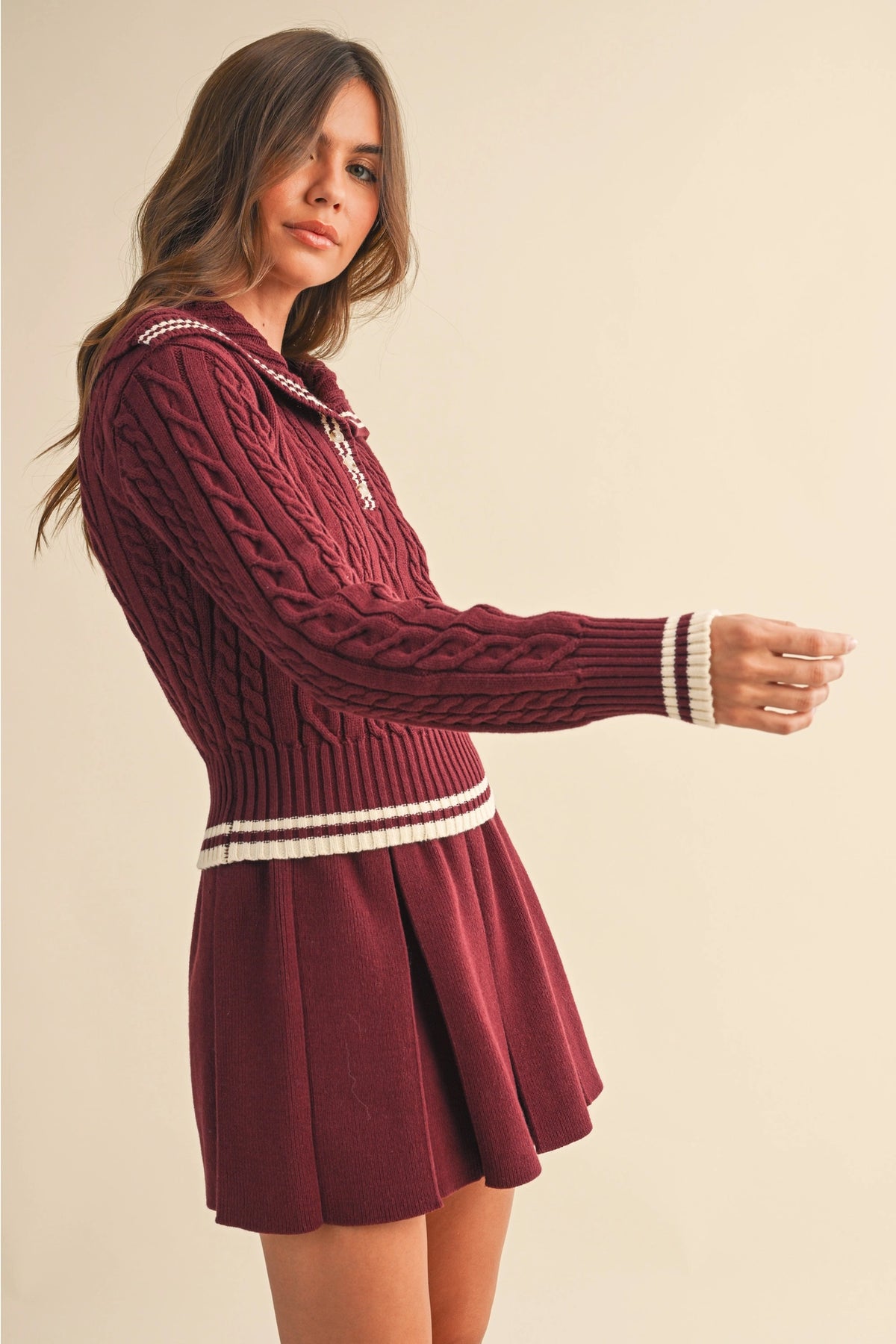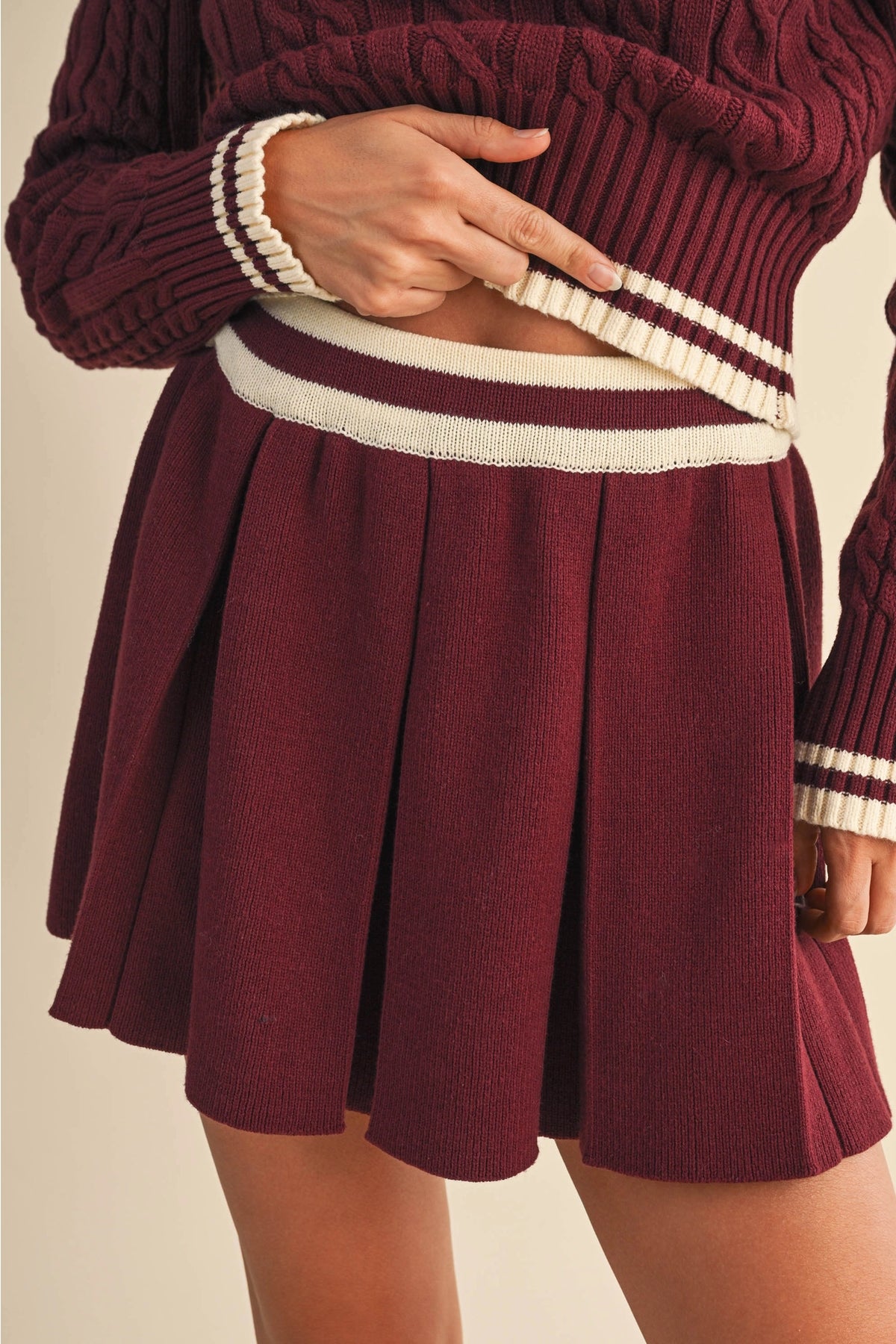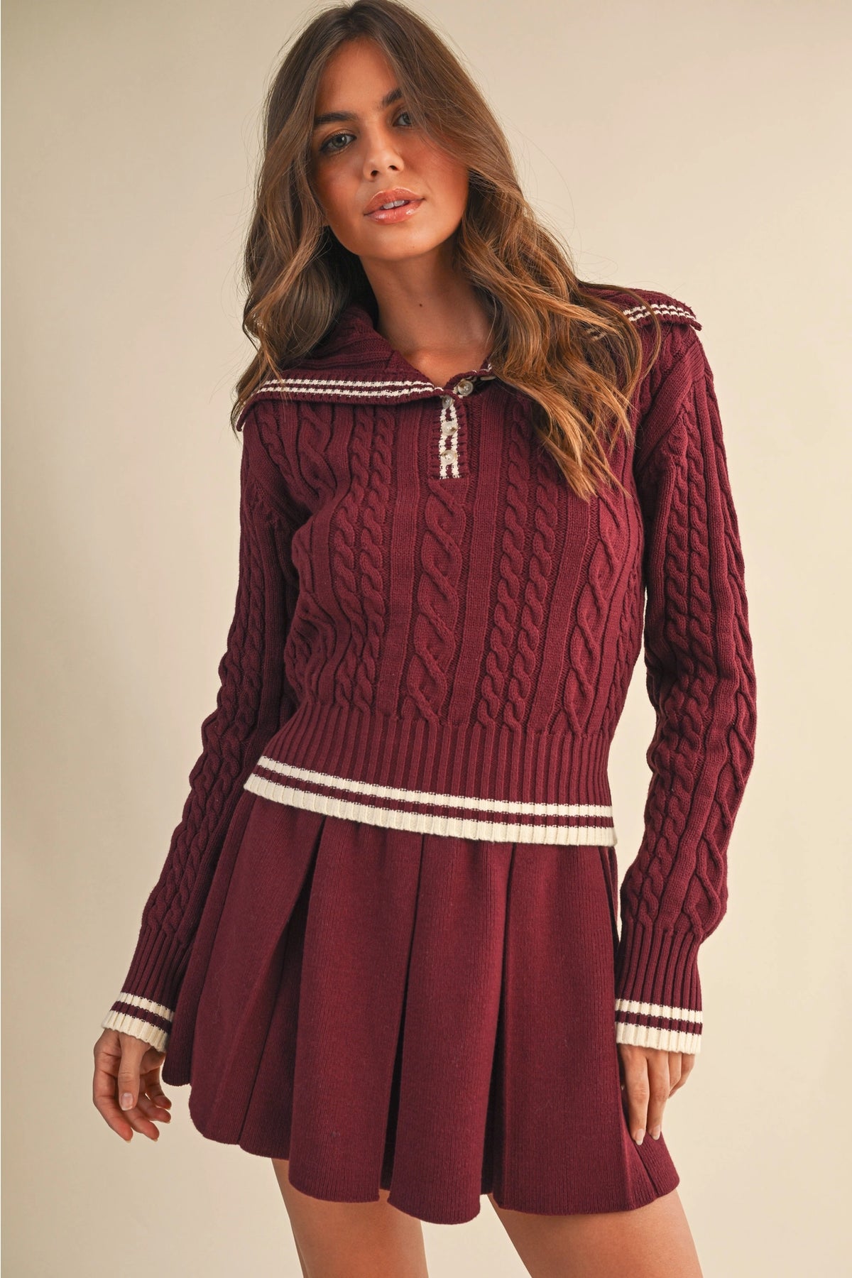 Serve timeless preppy style with our Varsity Collared Cable Knit Set. This chic two-piece look features a soft cream cable knit sweater with green stripe accents along the collar, cuffs, and hem for a classic sporty touch. The matching pleated mini skirt completes the effortlessly coordinated vibe — perfect for a casual brunch, a stroll around town, or a cozy fall day. Pair it with your favorite sneakers or boots for an elevated, laid-back look.