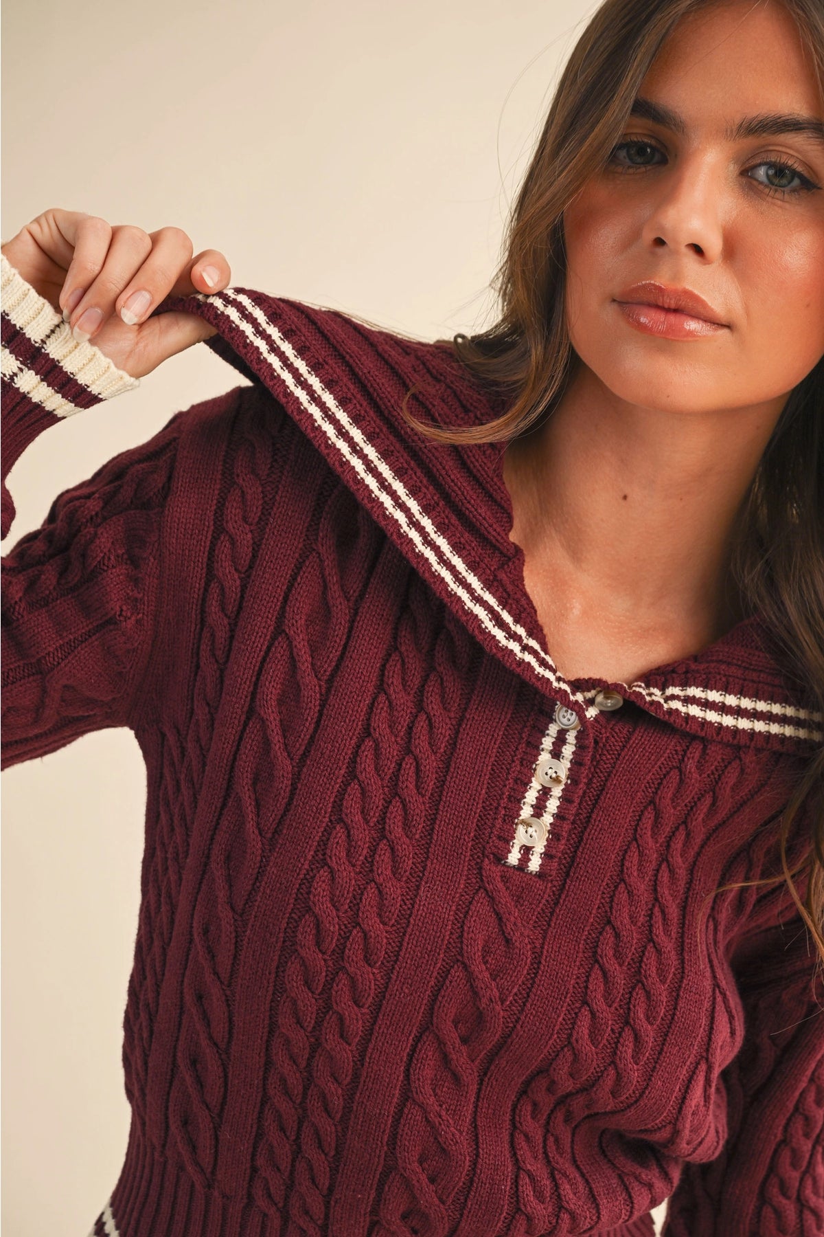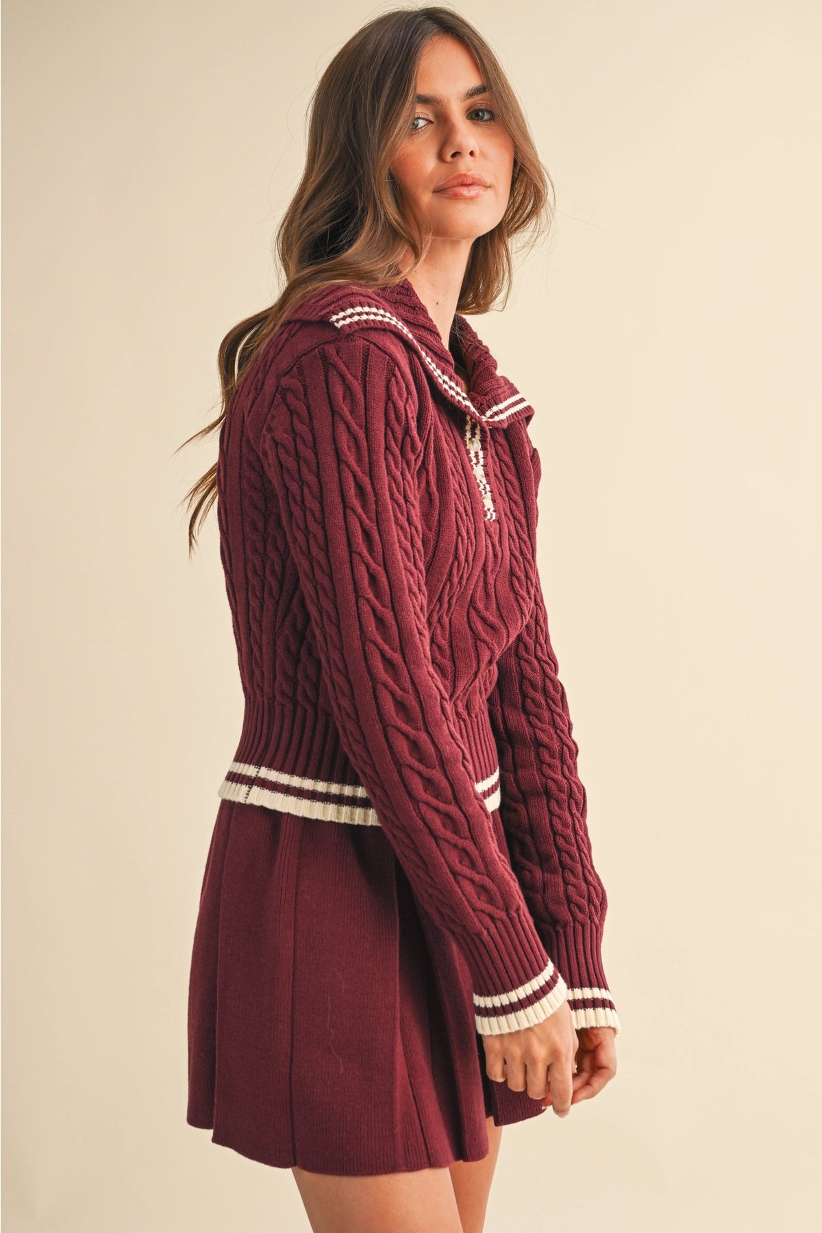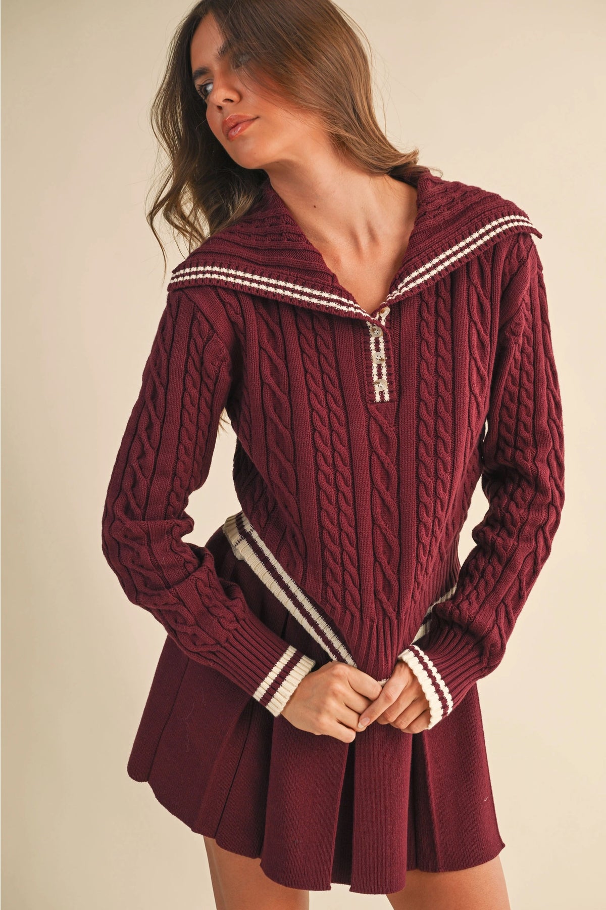 Serve timeless preppy style with our Varsity Collared Cable Knit Set. This chic two-piece look features a soft cream cable knit sweater with green stripe accents along the collar, cuffs, and hem for a classic sporty touch. The matching pleated mini skirt completes the effortlessly coordinated vibe — perfect for a casual brunch, a stroll around town, or a cozy fall day. Pair it with your favorite sneakers or boots for an elevated, laid-back look.