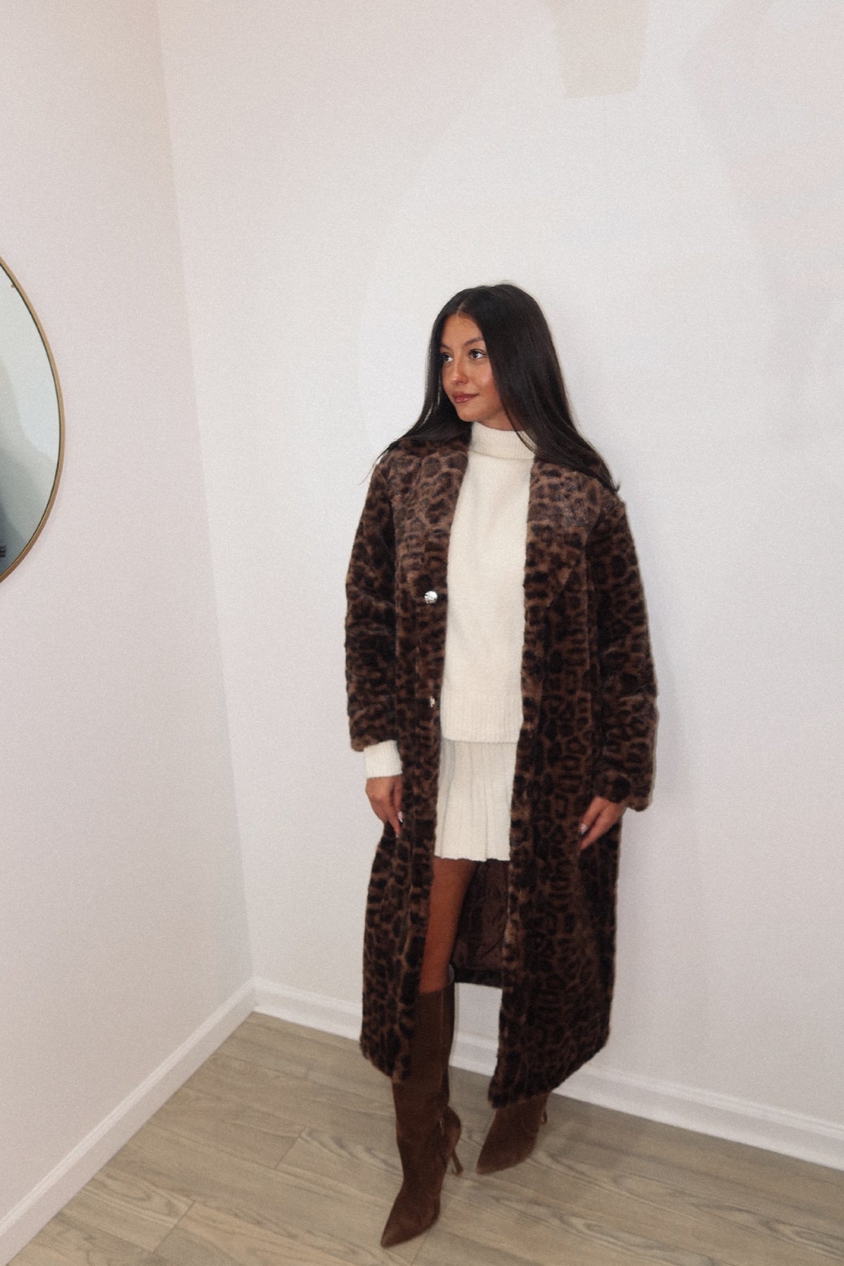 Wrap yourself in effortless sophistication with our Wildside Faux Fur Coat. This statement piece exudes confidence and timeless glamour with its rich, faux-fur texture and bold leopard print. Designed for the modern muse, it features a longline silhouette, notched lapel collar, and soft inner lining for all-day comfort and warmth. Whether you’re dressing up for a night out or elevating your everyday style, this coat delivers wild elegance with every step. Pair with sleek black boots and gold accessories for a chic, city-ready look.