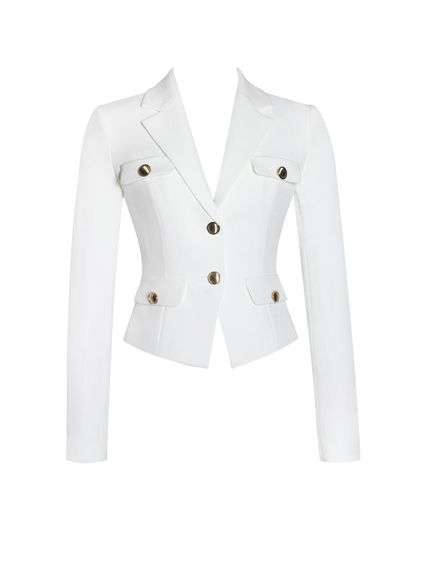 Elevate your wardrobe with the sophisticated Cream Blazer Jacket, a timeless piece designed to impress. Featuring a classic notched collar and elegant gold buttons, this blazer exudes refined charm. The long sleeves and padded shoulders provide a structured, tailored fit, while the design cinches at the waist to accentuate your silhouette. Decorative pocket caps add a polished finishing touch, making the Oakley Blazer Jacket a versatile and chic addition to any outfit. Find matching skort here: Cream Mini Skort