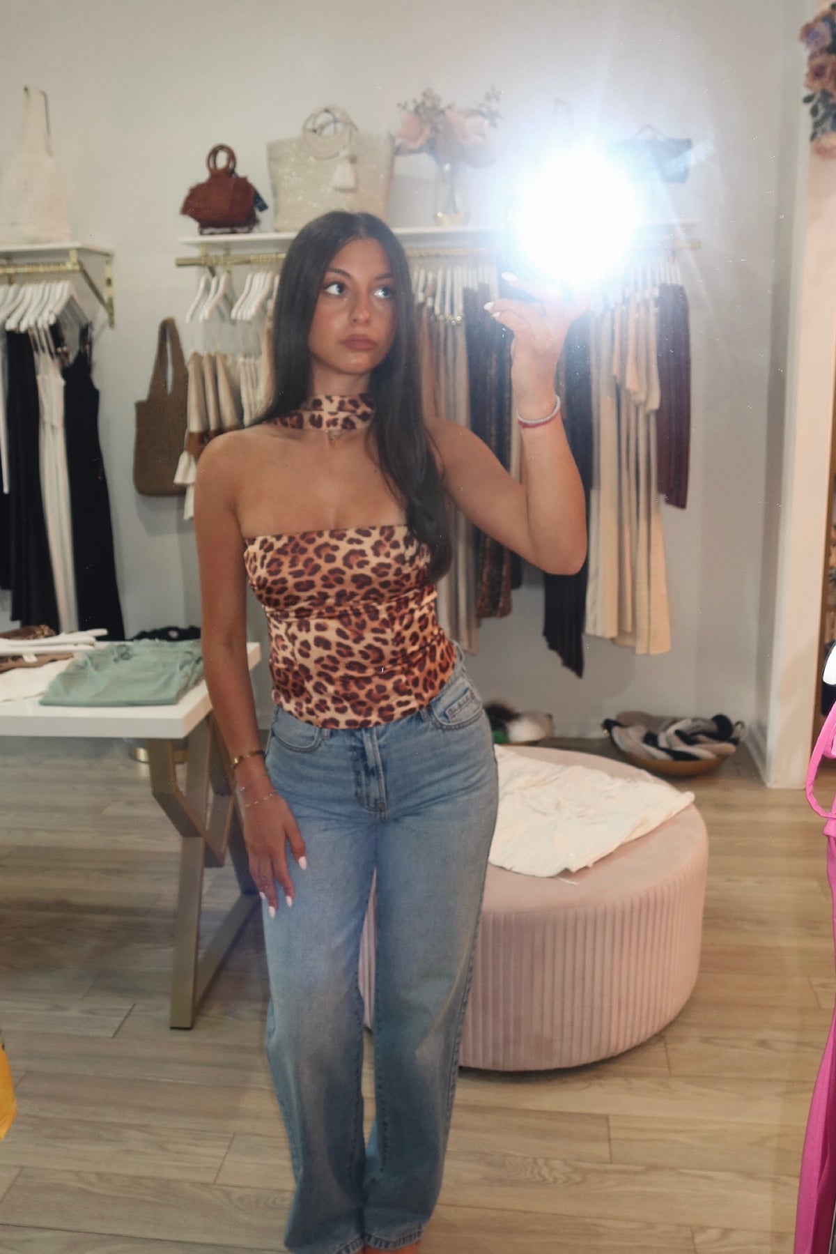 This top highlights femininity with a sultry leopard print and the illusion of a strapless neckline. This piece hugs the body and flatters the shoulders. A reverse halter top with a side-seam invisible zipper.